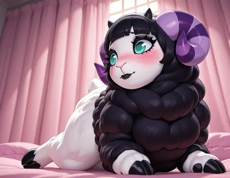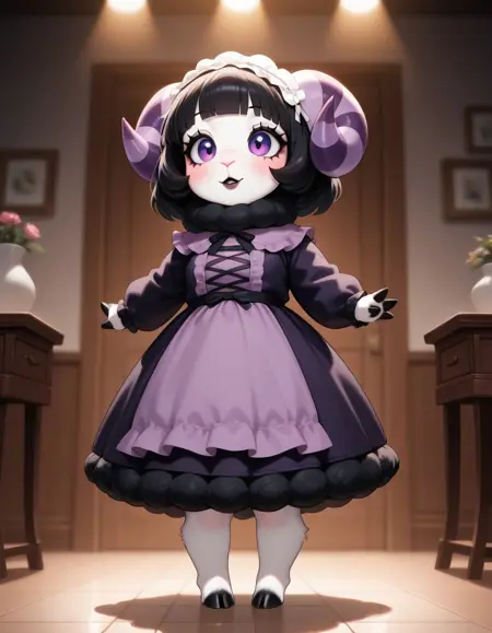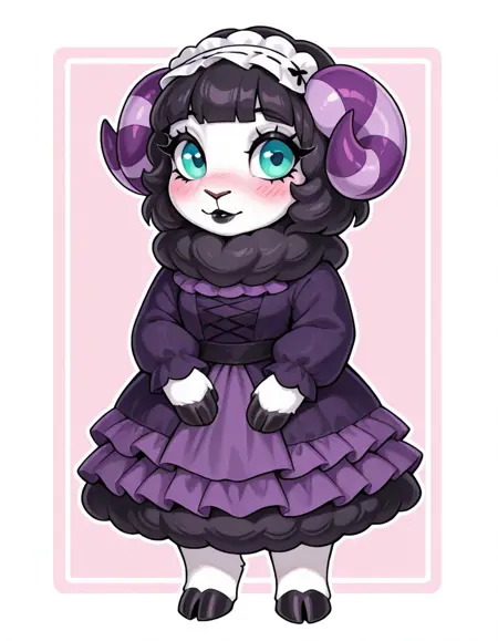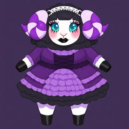 Muffy-AC, 白い毛, 黒い綿, 黒い羊, 紫色の縞模様の角, シアン色の目, 黒いまつげ, ピンクのほほ染め, 黒いリップ, 黒い蹄, 裸足