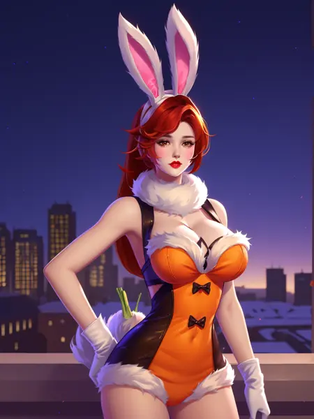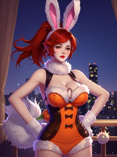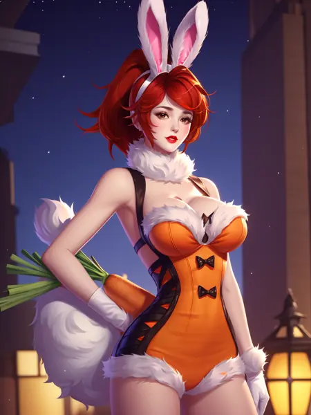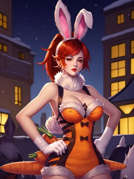 - WZRYhuamulanTNL, 1girl, rabbit ears, breasts,solo, carrot, white gloves, ponytail, red hair, long hair, cleavage, brown eyes, looking at viewer, parted lips, playboy bunny,fur trim, red lips,cityscape, night, mature female, cowboy shot, hand on hip,