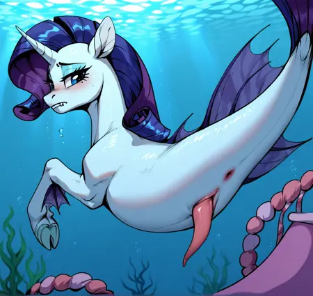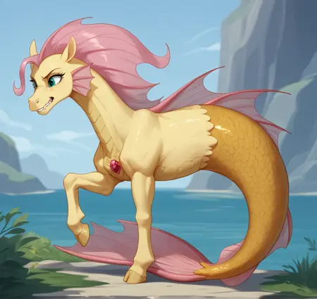 score_9, score_8_up, score_7_up, score_6_up, score_5_up, score_4_up, source_furry, source_pony, lora:EqG_Siren-Hippocampus_PonyXL:0.7 マイリトルポニー、サイレン、ヒッポカムポス、ヒレ、頭のフリル、宝石、人魚の尾、 Merpony、牙、二股の蹄