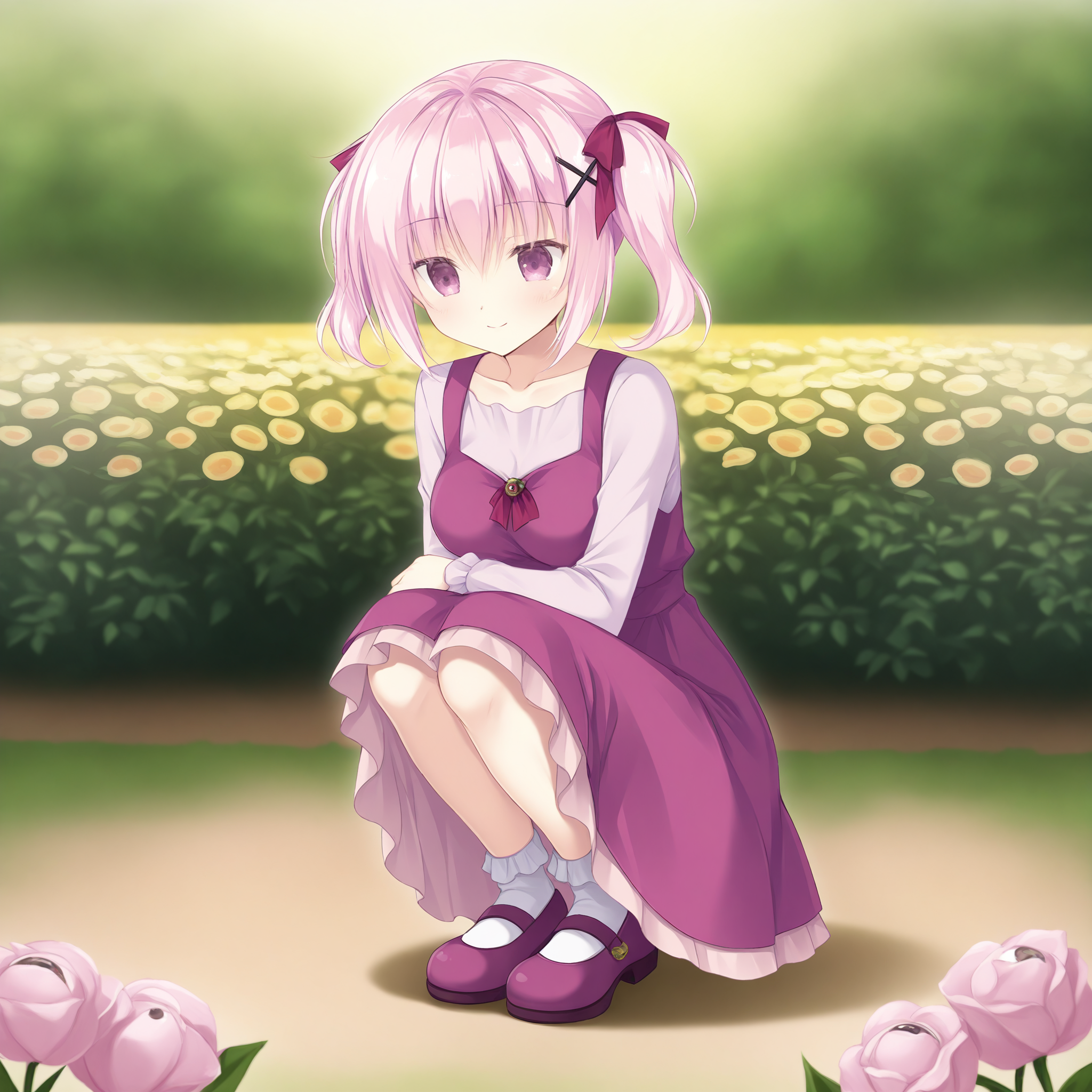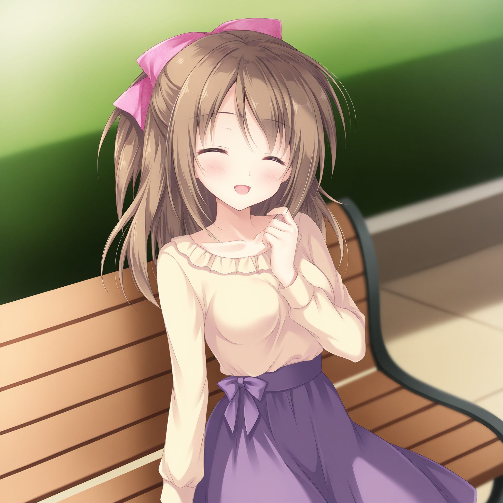 bow,hair bow,pink bow,shirt,breasts,long sleeves,purple skirt,