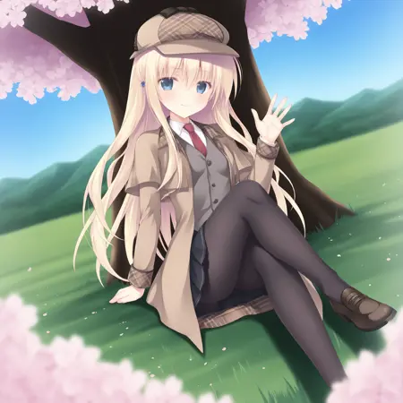 pantyhose,skirt,hat,red necktie,necktie,deerstalker,black pantyhose,shirt,pleated skirt,black skirt,coat,long sleeves,white shirt,vest,brown coat,shoes,brown footwear,