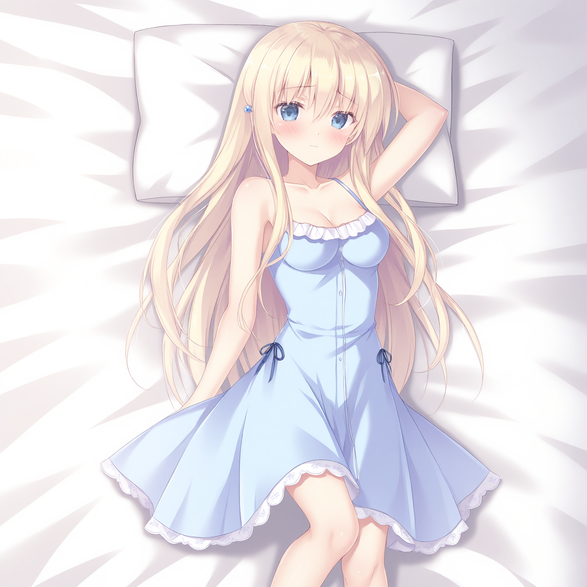 breasts,cleavage,collarbone,hair ornament,dress,bare shoulders,blue dress,bare arms,