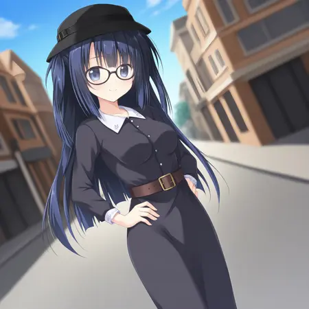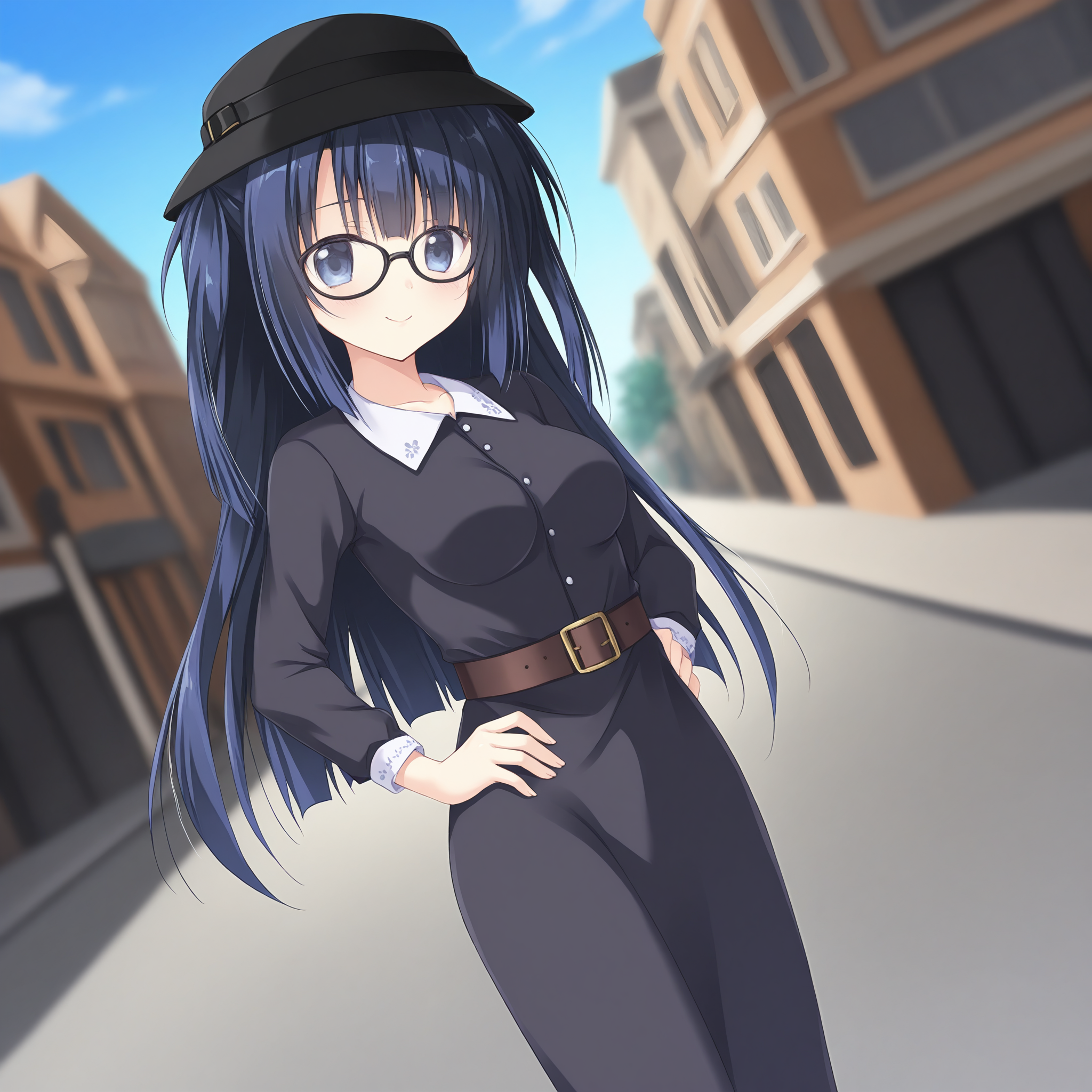 dress,glasses,belt,hat,breasts,collared dress,black headwear,two side up,