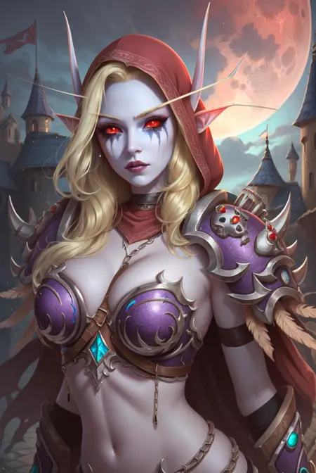 NSFW_WOW_SylvanasWindrunner_ownwaifu, 1girl, black eyeshadow, blonde hair, colored skin, dark elf, ears through headwear, glowing eyes, hood up, long eyebrows, long hair, pointy ears, purple skin, red eyes, undead, very long ears, large breasts, navel, nipples, hood, colored sclera, nude, long pointy ears, makeup