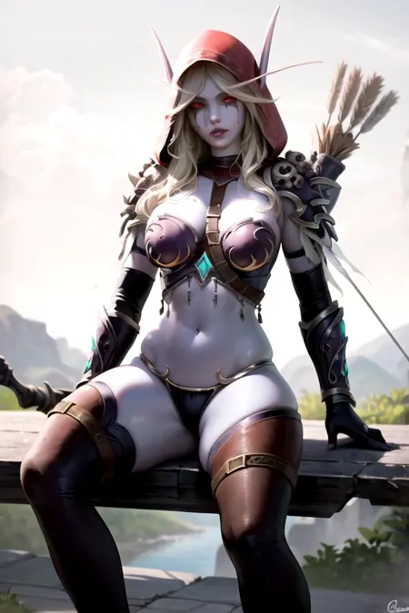 GAME_WOW_SylvanasWindrunner_ownwaifu, 1girl, red eyes, glowing eyes, black eyeshadow, blonde hair, purple skin, undead, very long ears, colored skin, dark elf, ears through headwear, hood up, long eyebrows, long hair, pointy ears, bikini armor, shoulder armor, ornate armor, hood, pauldrons, quiver, lips, colored sclera, navel, cleavage, midriff, skull, cape, facial mark, gauntlets, large breasts, black pants, feathers, lipstick, gloves, makeup, shoulder pads, weapon on back, choker, jewelry, red lips, long pointy ears, breastplate, chainmail, cloak, fingerless gloves, gem, horns, nose, skeleton, spikes,