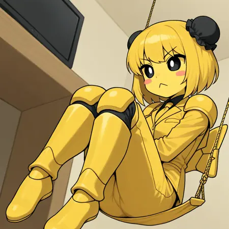 (:0.85) オフィスのドローン:カクナ、シングル、1girl、黄色い肌、色付きの肌、黒い目、白い瞳、胎児の姿勢、腕を組んだ、実線の目、ほほ赤いステッカー、黄色いネクタイ、擬人化、黄色い髪、短い髪、:<、V字型の眉、黒い結び目カバー、黄色いスーツ、黄色い膝当て、黄色い肩当て、黄色い膝パッド、黄色い椅子、浮いている椅子、黄色いブランコ、