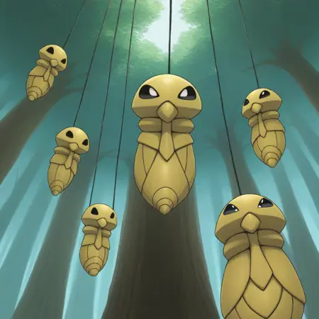 カクナ。とても黄色で、ほとんど動かない。 Weedle から進化させると、攻撃力が維持されるため、レベルアップが easier になるかもしれない。