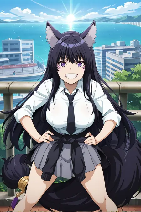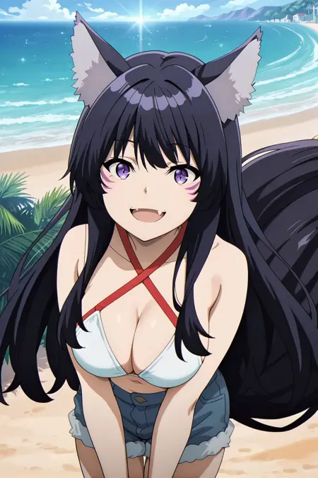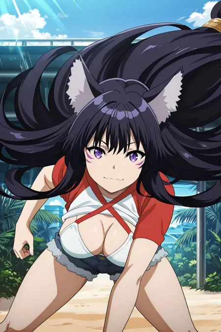 Delta, 1girl, solo, purple eyes, black hair, long hair, wolf ears, animal ears fluff, wolf tail, facial mark, large breasts,