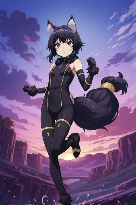 Delta, 1girl, solo, purple eyes, black hair, short hair, wolf ears, animal ears fluff, wolf tail, facial mark, small breasts, aged down, young,