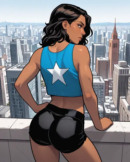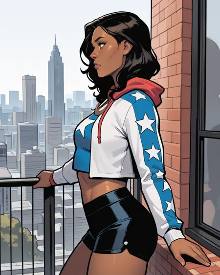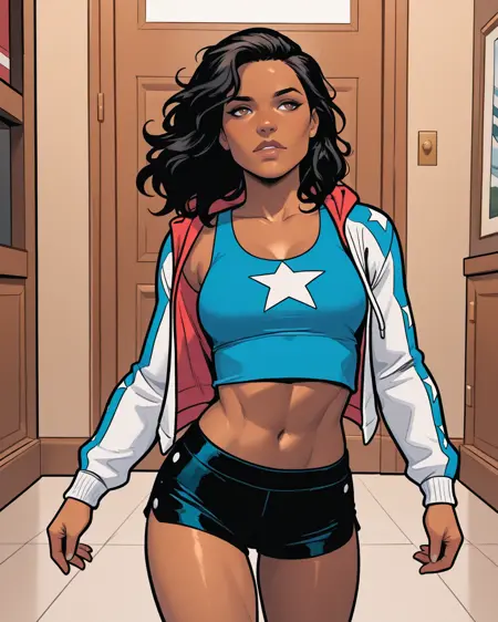 West Coast Avengers: americachavez, black hair, brown eyes, dark-skinned female, shorts, tank top, crop top, hoodie