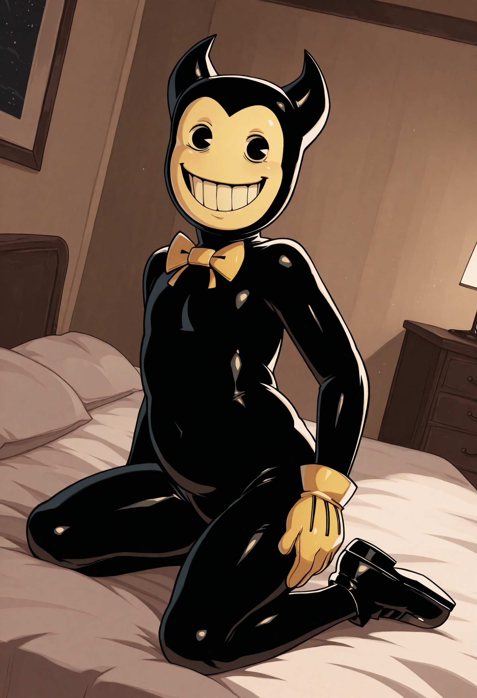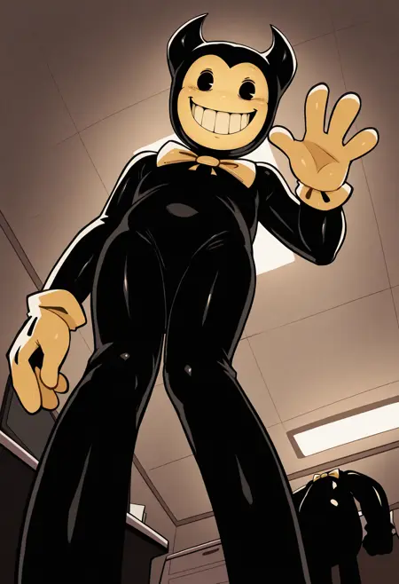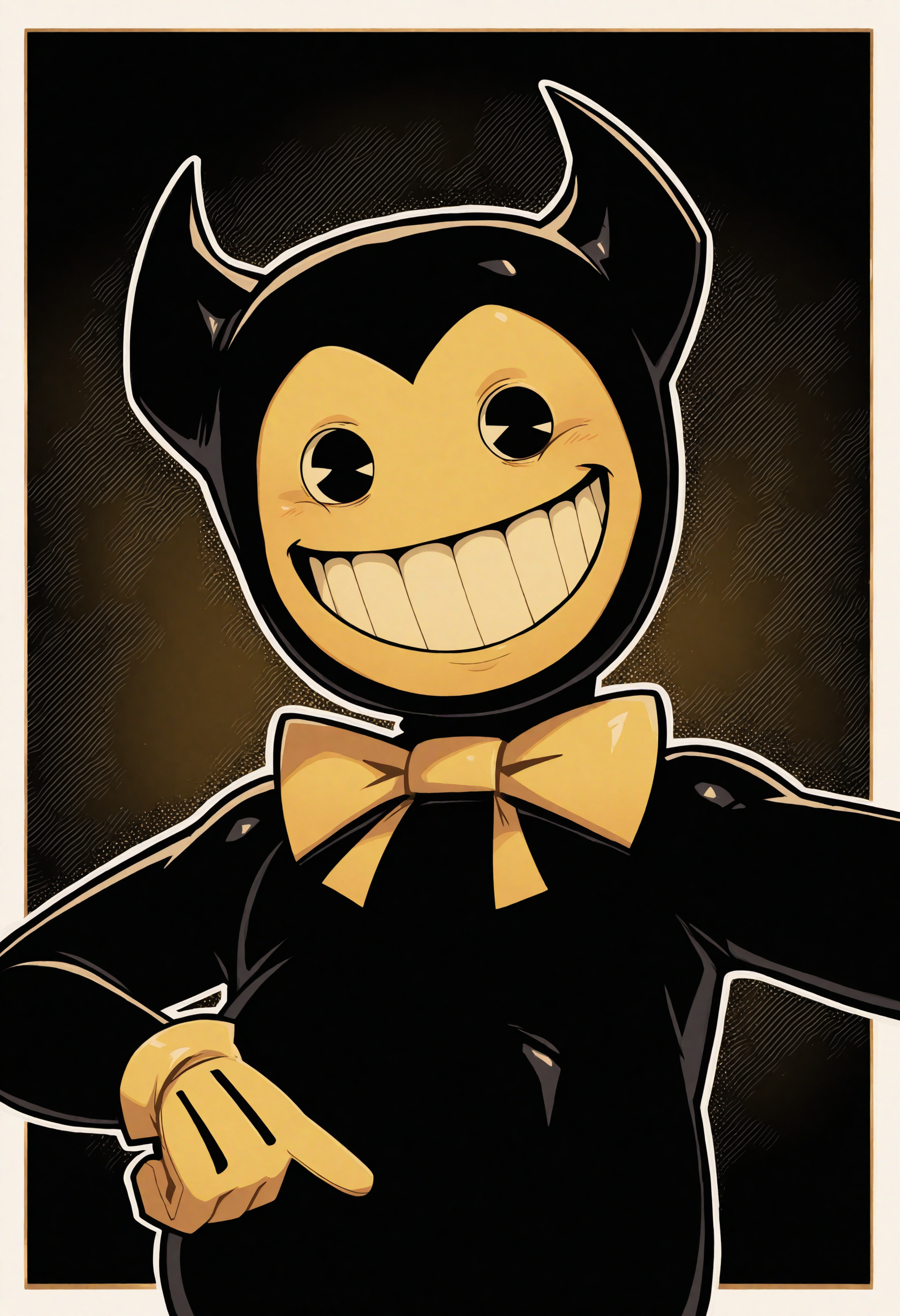 1boy, solo, ollie, bendy the dancing demon, black skin, 2 horns, black eyes, smile, grin, bow tie, gloves, black shoes