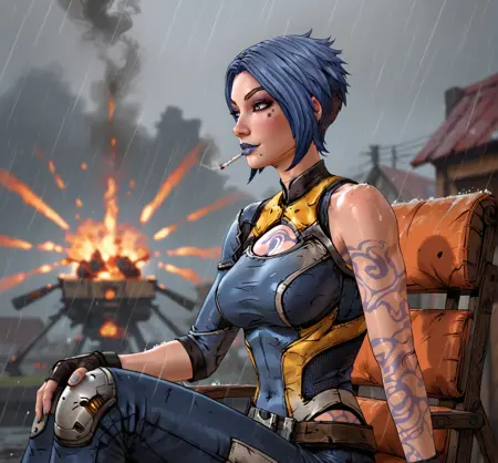 面部: <lora:Maya:0.75> 来自《无主之地2》的Maya,蓝色短发,银色眼睛,妆容,蓝色唇膏,右脸颊上有蓝色美人痣,微笑,(美丽的眼睛和面部:1.1)