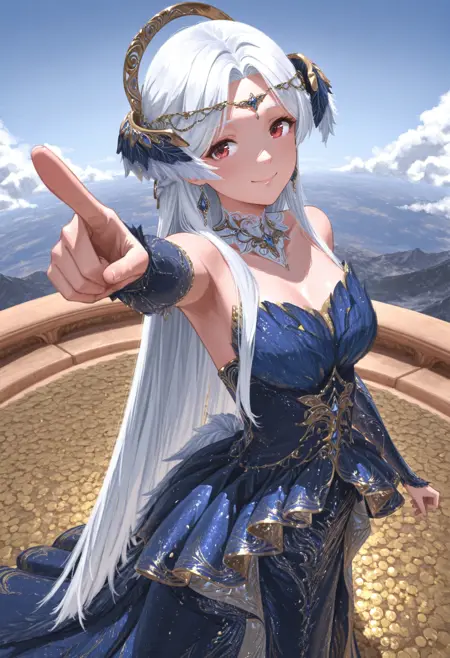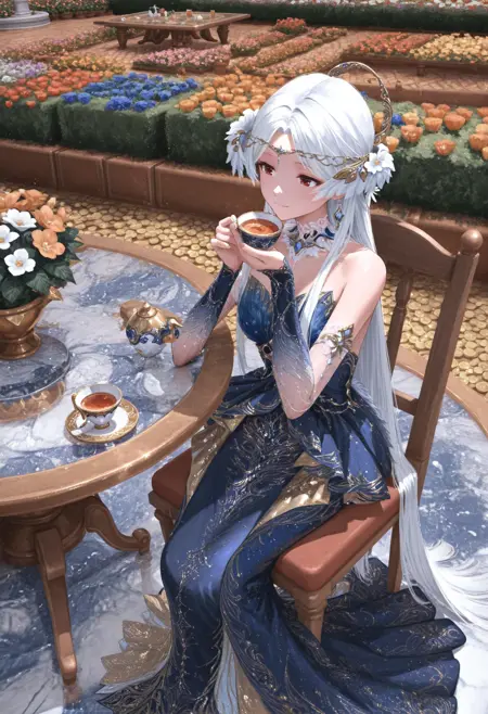 두 번째 진화(테어스): "nikki, SilvergaleAriaTears dress, blue dress, gold sequins, white hair"