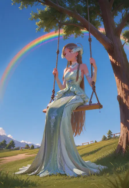 복장은 색상에 대해 유연하게 조정할 수 있으며, "x dress" 또는 "x hair"를 추가하여 변경할 수 있습니다. 예를 들어, 샘플 이미지에서는 경량 녹색 드레스를 생성하기 위해 "light green dress"라는 프롬프트를 사용했습니다.
