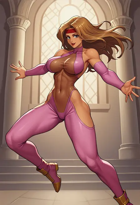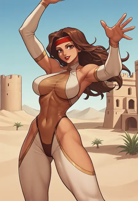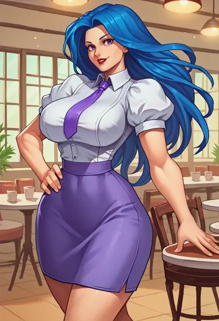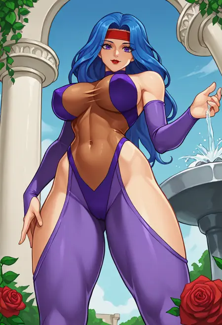 캐릭터 (아수라 버스터): 파란 머리, 긴 머리, 보라색 눈, 입술, 빨간 립스틱, 큰 가슴