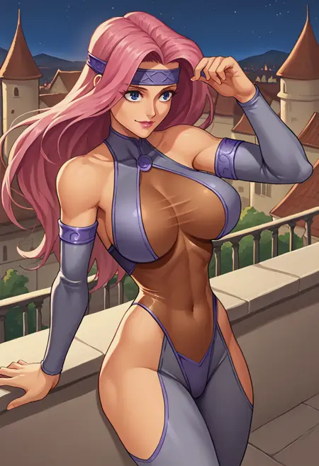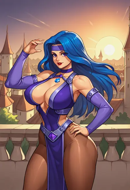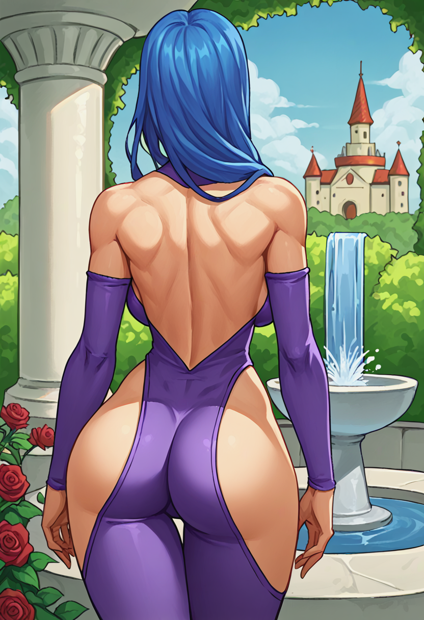 복장 (아수라 버스터): rmoutfit, 보라색 rmoutfit, 파란 머리, 빨간 헤드밴드, 분리된 보라색 소매, 불가능한 옷, 불가능한 레오타드, 투명한 레오타드, 갈색 레오타드, 배꼽 가린 옷, 등이 드러난 옷, 보라색 레깅스, 엉덩이 통기구, 파란색 발목 부츠