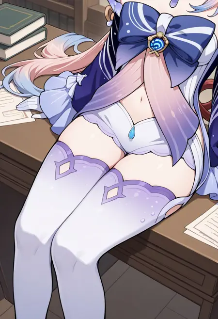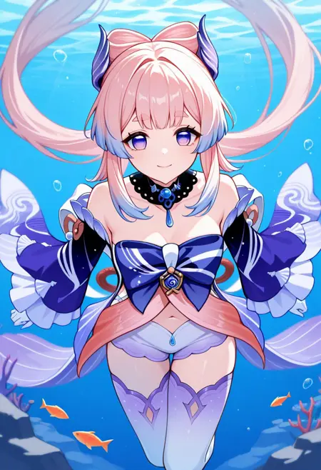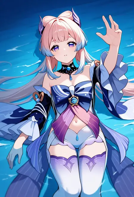기본 외모를 위한 트리거: KokomiDefault, 분홍색 머리, 다색 머리, 긴 머리, 배꼽, 허벅지 양말, 흰색 하의, 비전 (Genshin Impact), 활 모양의 머리, 흰 장갑,
