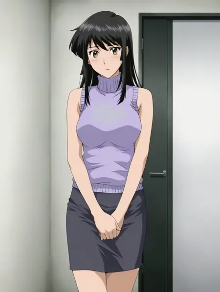 便服1:紫色毛衣,无袖高领衫,灰色铅笔裙