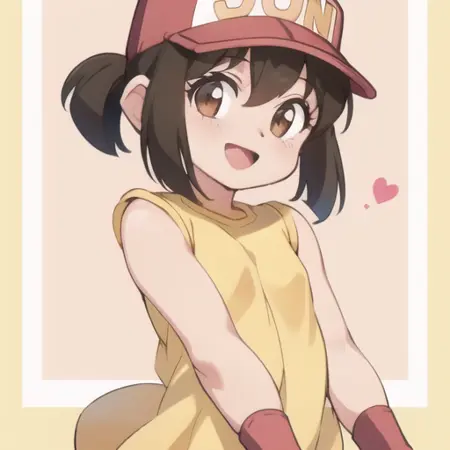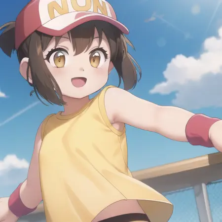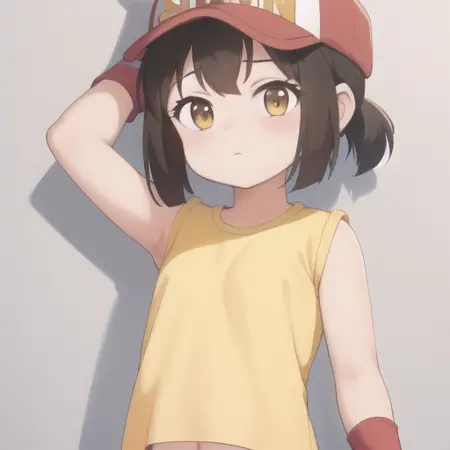提示词:黄色上衣、裸露的手臂、红色短裤