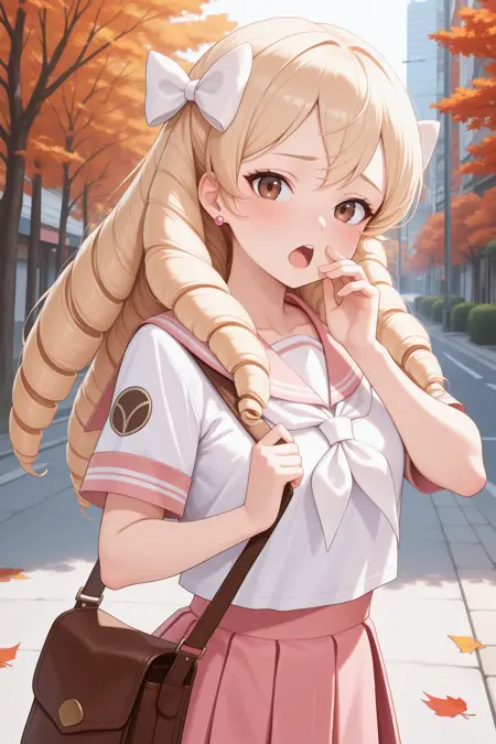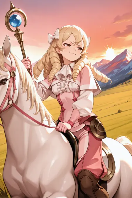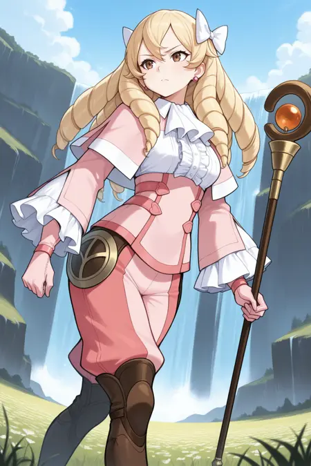 彼女の典型的な外見には、「髪飾り、白いリボン、イヤリング、ピンクのカーディガン、白いアスコット、ピンクのシャツ、中央のフリル、ピンクのパンツ、ゆったりしたパンツ、ピンクの手袋、白い袖、茶色のブーツ」を追加してください。