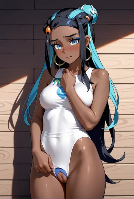 | 训练词汇 | Nessa, long hair, blue eyes, black hair, hair ornament, blue hair, necklace, dark-skinned female, short shorts, single hair bun, bike shorts, armband, wristband, single glove, sports bra, partially fingerless gloves, hoop earrings, blue gloves, belly chain, dynamax band, sandals已复制! |