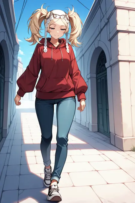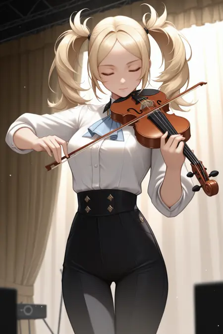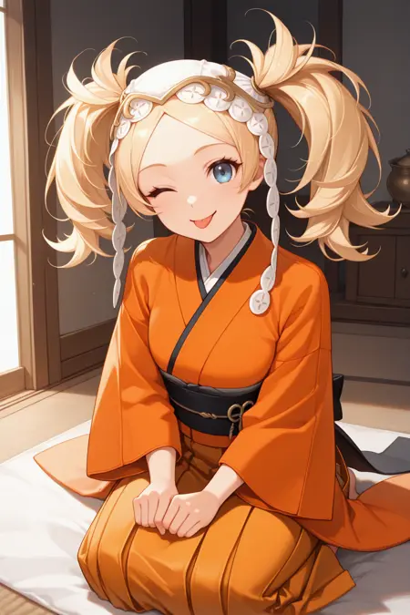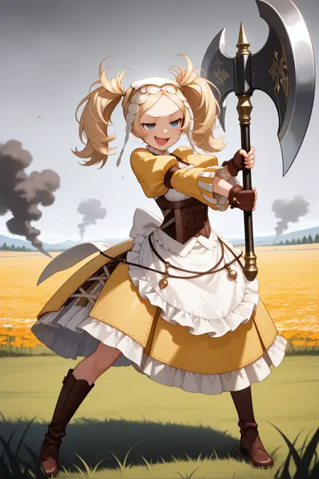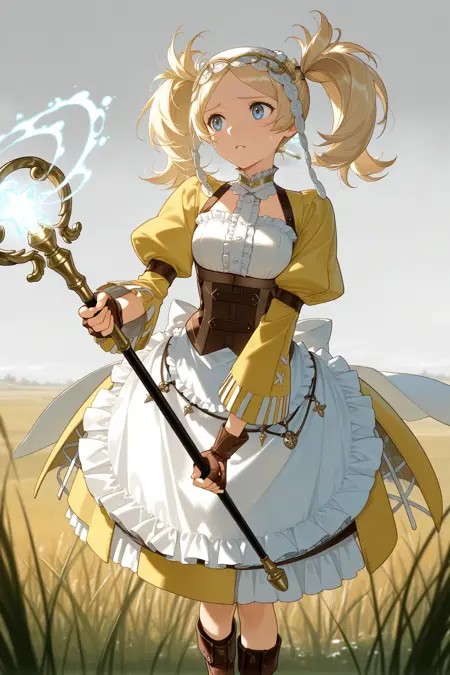 为她的常规造型添加:"baseliz, blue eyes, blonde hair, twintails, white headdress, yellow dress, white shirt, frills, brown corset, puffy sleeves, long sleeves, waist apron, white apron, brown gloves, fingerless gloves, brown boots"