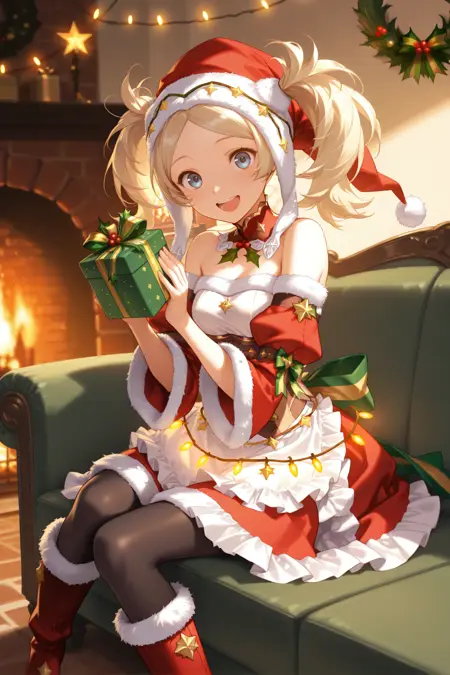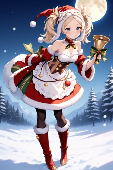 为冬季莉莎添加:"wtrliz, blue eyes, blonde hair, twintails, santa hat, red collar, bare shoulders, fur trim, red dress, red sleeves, wide sleeves, brown underbust, white apron, frilled apron, black pantyhose, red boots, fur-trimmed boots"