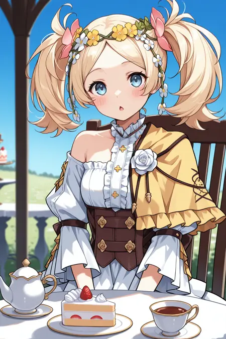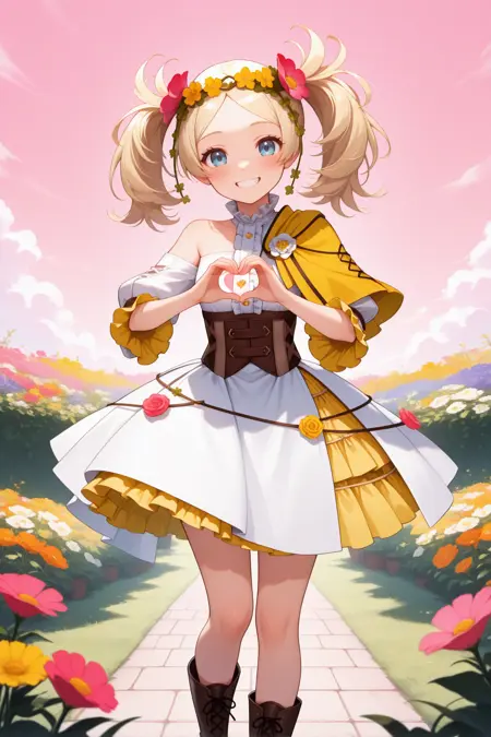 为情人节莉莎添加:"valliz, blue eyes, blonde hair, twintails, hair flower, head wreath, hair ornament, side cape, yellow capelet, single bare shoulder, frilled sleeves, frilled collar, brown corset, white dress, layered skirt, lace-up boots"
