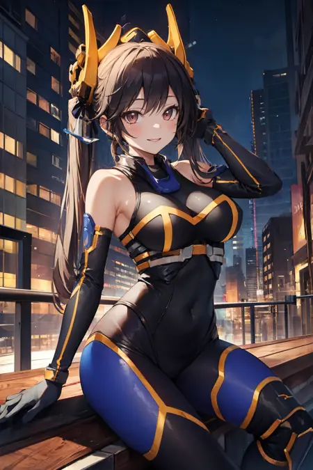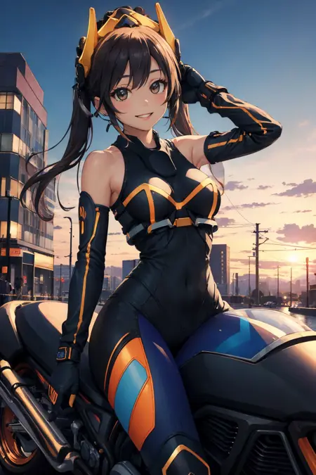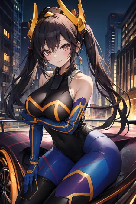 IP2: ip2, 1girl, ヘッドギア, ボディスーツ, 肩出し, ツインテール, 肘までグローブ