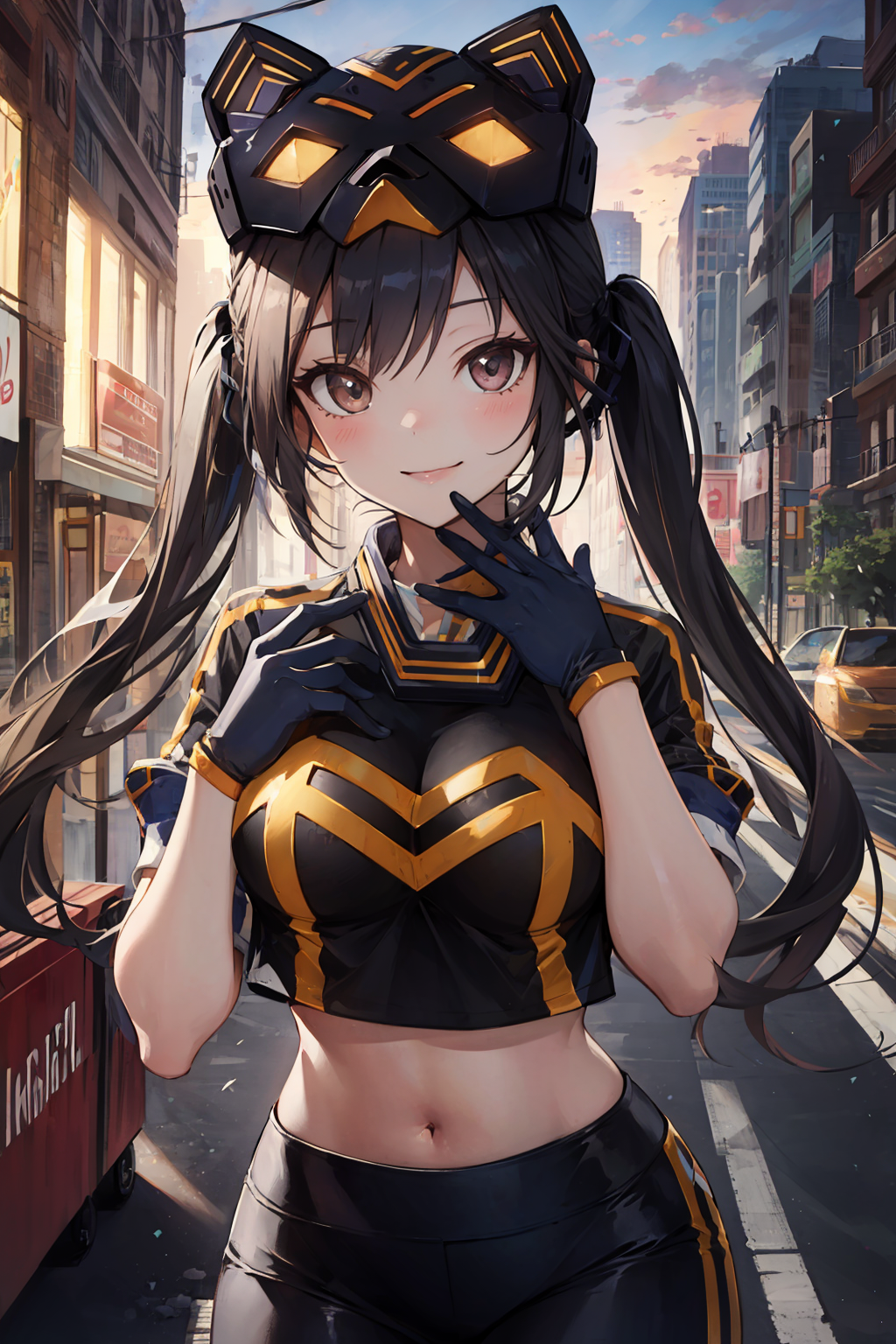 IP1: ip1, 1girl, キャットマスク, クロップトップ, 緊張したパンツ, ツインテール, 短袖, グローブ