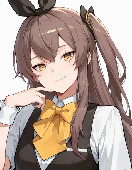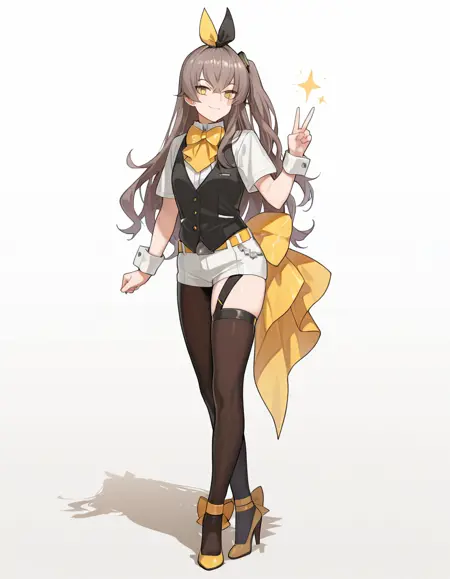 HopefulFirewatchMagician, HFM_shirt, HFM_vest, HFM_shirt_bow, HFM_thigh_straps, HFM_short_shorts, HFM_belt, HFM_single_thighhigh, HFM_single_leg_pantyhose, uneven legwear, HFM_wrist_cuffs, thigh, HFM_bowtie,HFM_hair_bow,HFM_hair_ribbon, HFM_high_heels