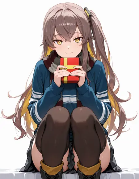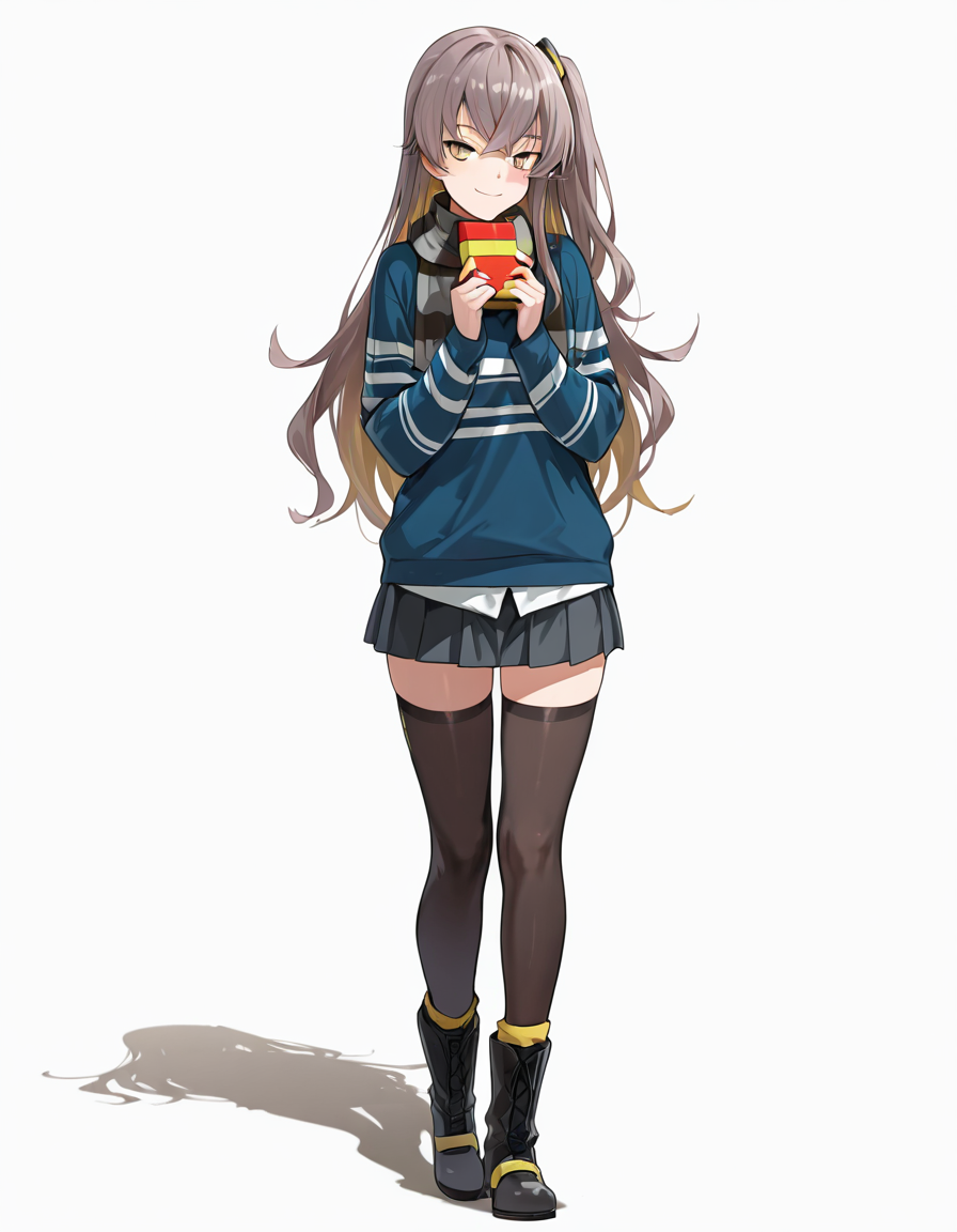 UMP45def, def_hair_ornament, def_scarf, def_hooded_jacket, def_thigh_straps, def_knee_pad, def_exoskeleton, def_shirt, def_skirt, def_fingerless_gloves, def_pantyhose, def_neck_ribbon, def_armband, def_boots