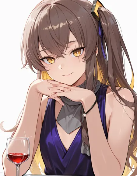 UMP45、茶色の髪、ロングヘア、片側を上げたスタイル、黄色い目、目の横に傷跡