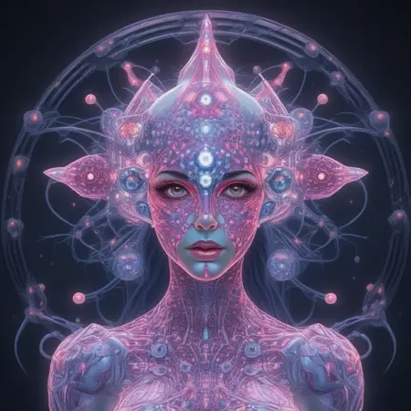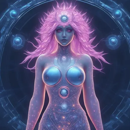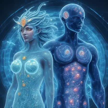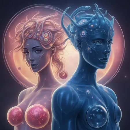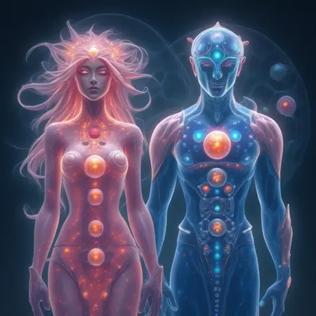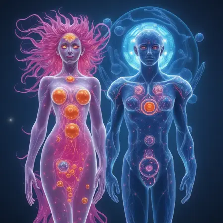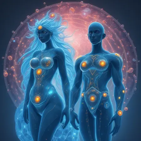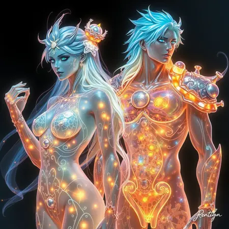 은하 피부 생물발광 투명한 여성/프로토셀 여신들/PAWG 생물발광 투명한 은하처럼 피부와 머리카락, 진주 빛 색조로 빛나며, 몸 안에 고세균과 세균이 존재. 생물발광 투명한 남성/프로토셀 신도 동일한 생물발광 투명한 피부를 지니고 있으며, 그의 남성/프로토셀 생물발광 투명한 몸 안에는 원소와 광물이 들어 있음. 옆에 서 있는 모습, 걸작 애니메이션 스타일 원피스. NSFW 걸작. 32k, 8k, 4k,
