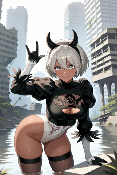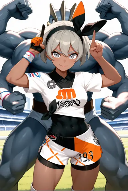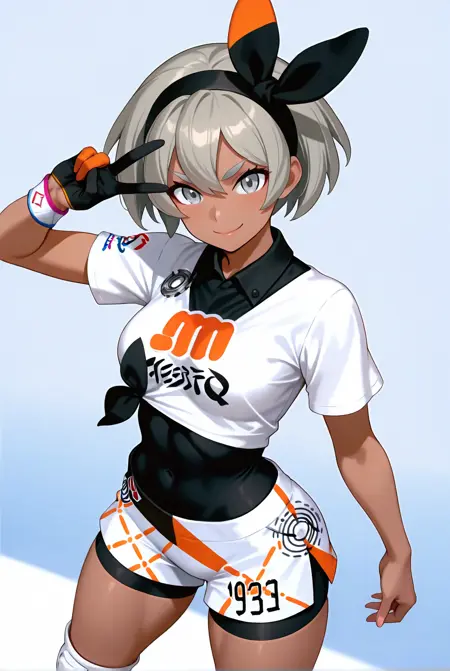 | 训练词汇 | Bea, short hair, grey eyes, grey hair, white shirt, black gloves, collared shirt, dark-skinned female, v-shaped eyebrows, short shorts, black hairband, wristband, single glove, white shorts, partially fingerless gloves, black bodysuit, knee pads, tied shirt, bow hairband, two-tone gloves, bodysuit under clothes, dynamax band, side slit shorts已复制! |