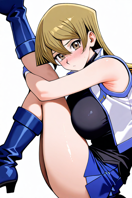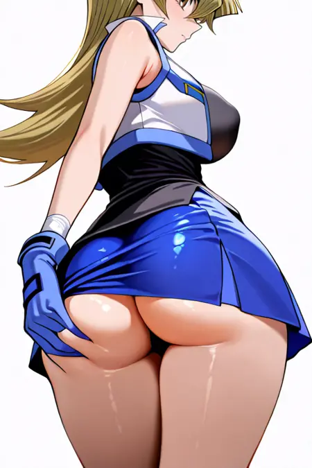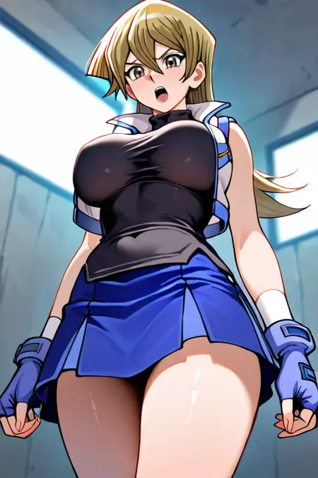 大きな胸, asukavdef, シャツなしのジャケット, 白いジャケット, 開いた服, チュールネック, 緊張した服, 黒いシャツ, 青い手袋, ミニスカート, 青いスカート, ブーツ, 青い靴,