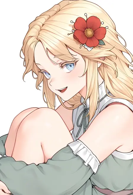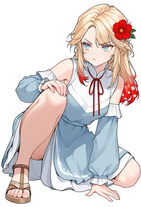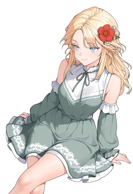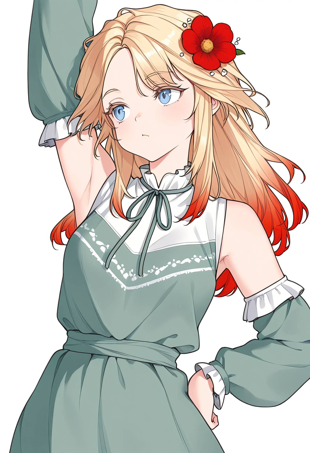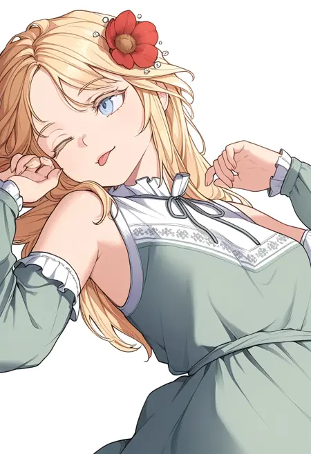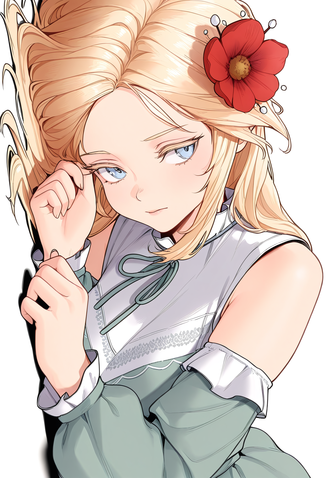 amelia/cnn, 1girl, long hair,hair flower,red flower,blonde hair,blue eyes,