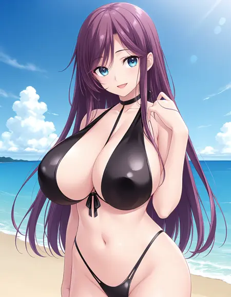 outfit04、ビキニ、黒いビキニ、ストリングスビキニ、マルチストラップビキニ、チョーカー、黒いチョーカー、フロントタイアップビキニトップ、ハイレッグ、ハイレッグビキニボトム、性器、