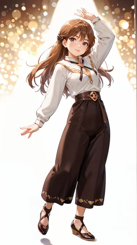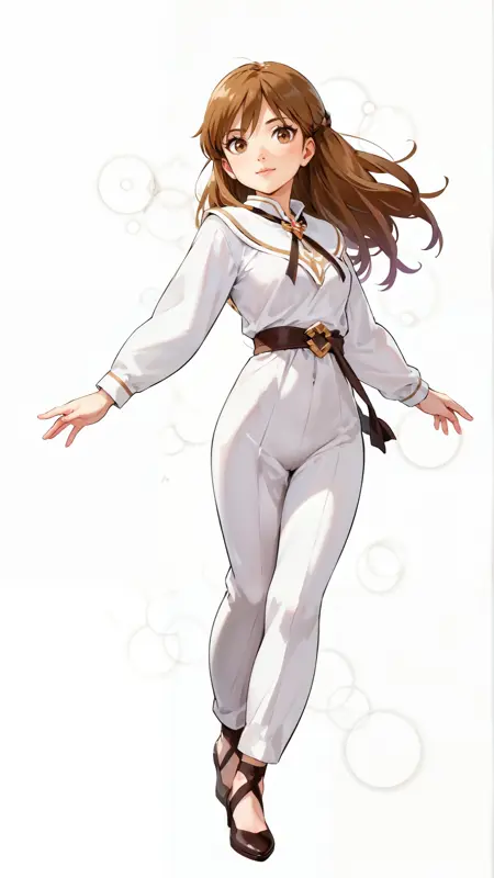 例: "yui_uzuki, アニメの少女, 1girl, ソロ, 長い髪, 視線を向ける, 笑顔, 簡単な背景, 茶色の髪, 白い背景, 茶色の目, フルボディ, ブローチ, レトロなアートスタイル, 立ち姿, ダイナミックなポーズ"