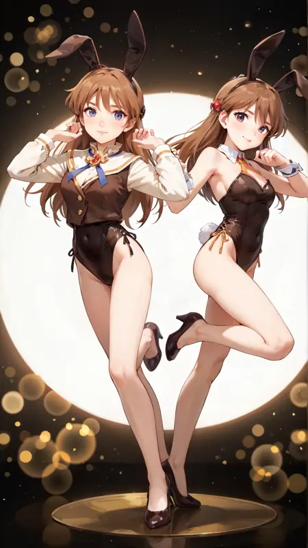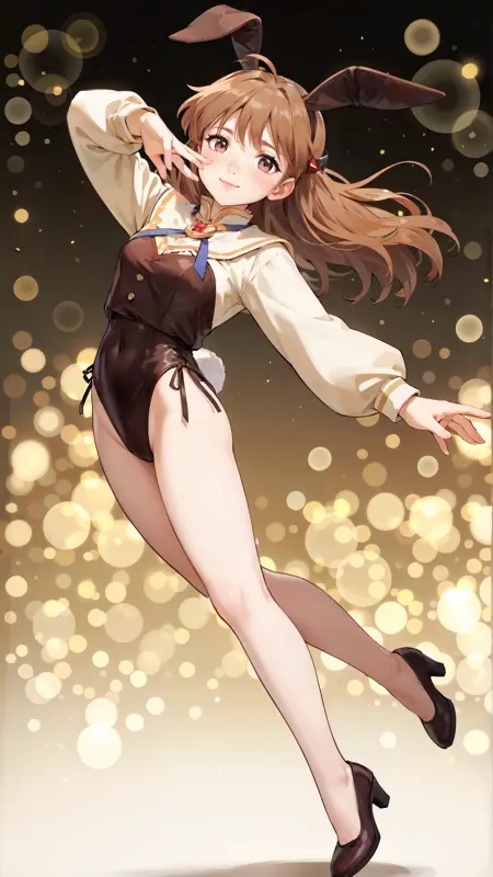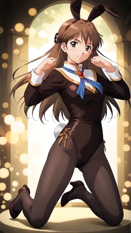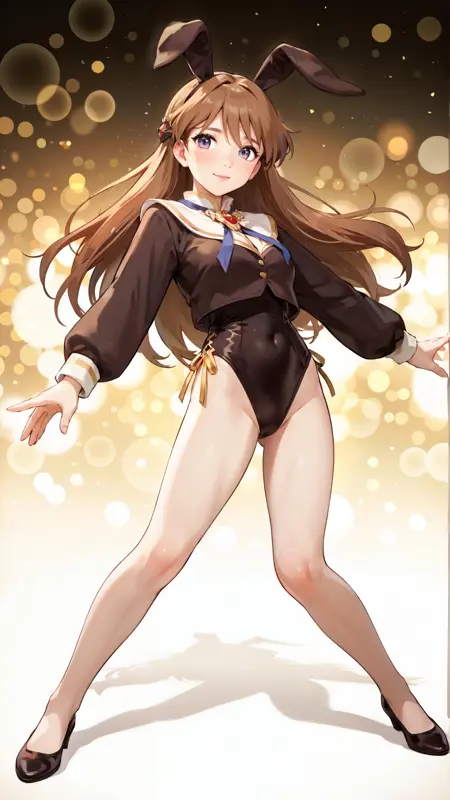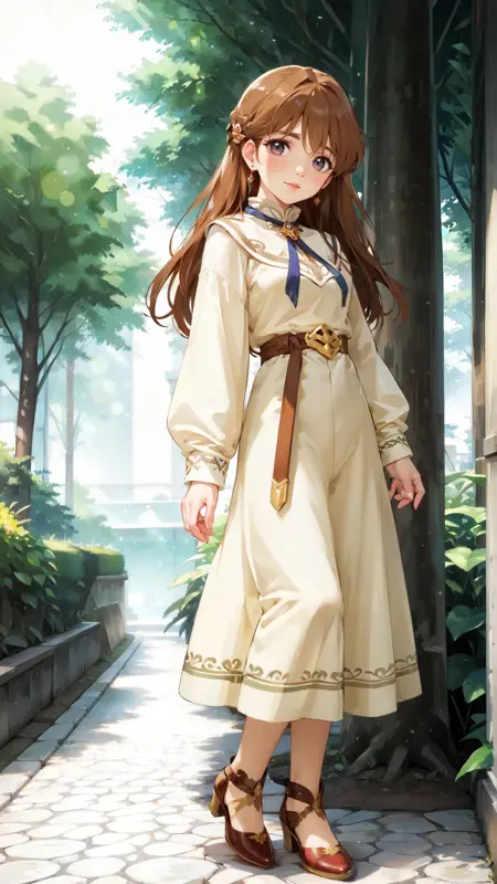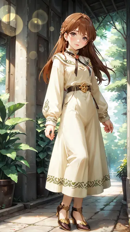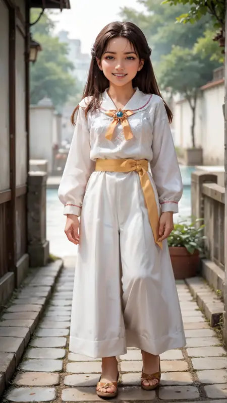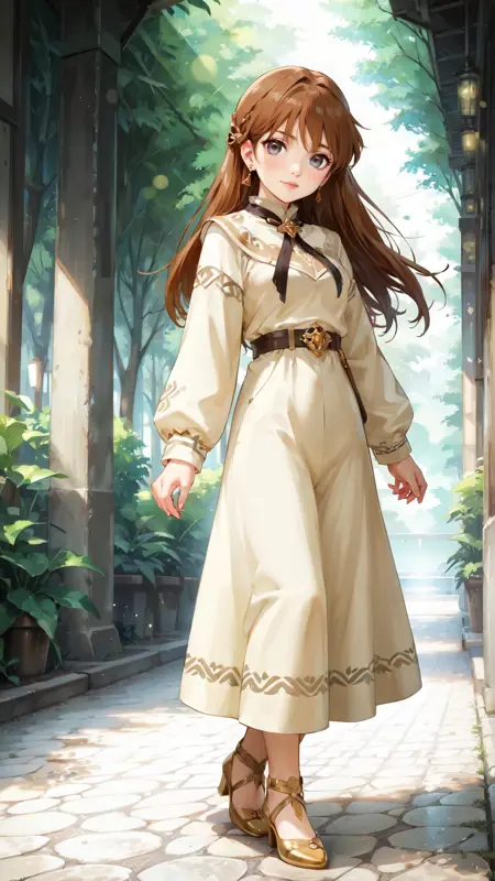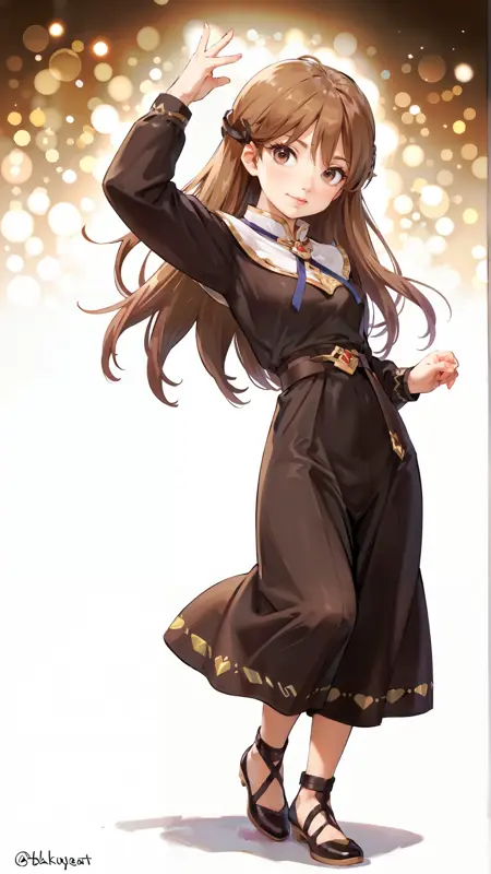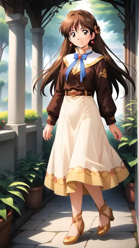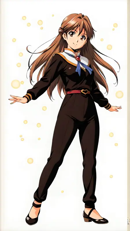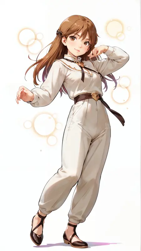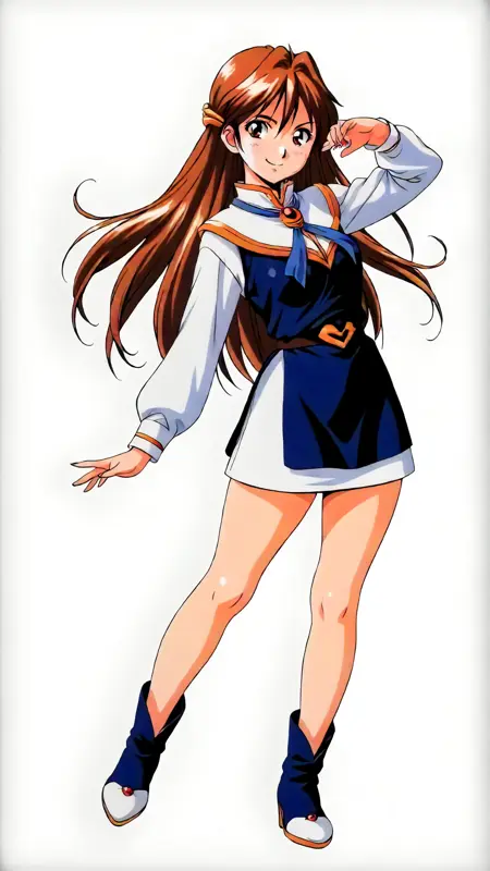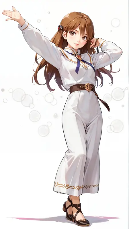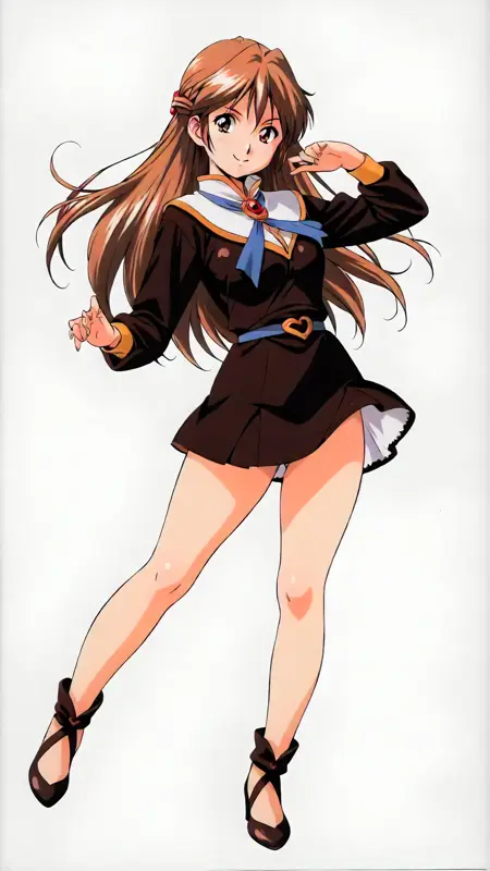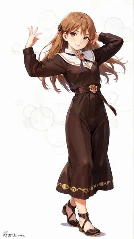 示例提示:"yui_uzuki, 一名动漫女孩, 1girl, 单人, 长发, 看向观众, 微笑, 简单背景, 棕色头发, 白色背景, 棕色眼睛, 全身, 胸针, 复古艺术风格, 站立, 动态姿势, "