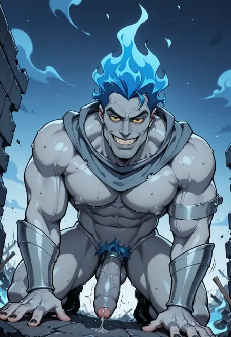 Flame hair, blue flames, black eyes, colored sclera, yellow sclera, black nails, sharp nails,