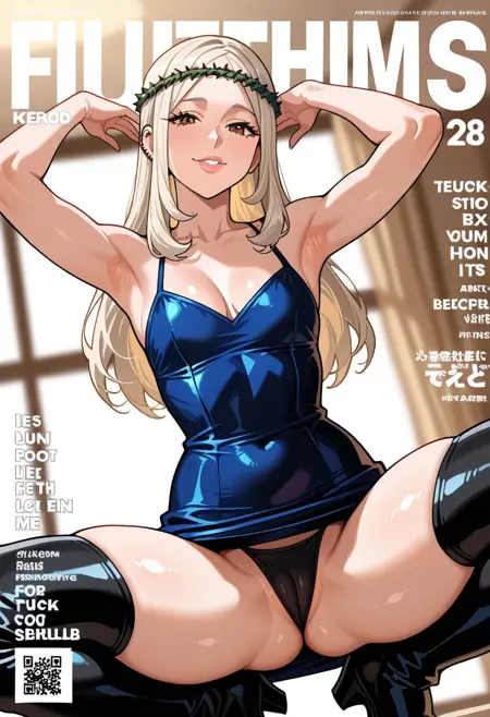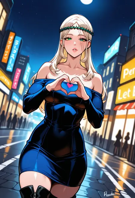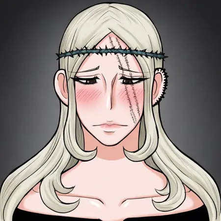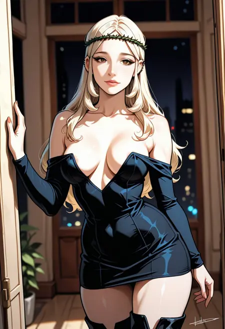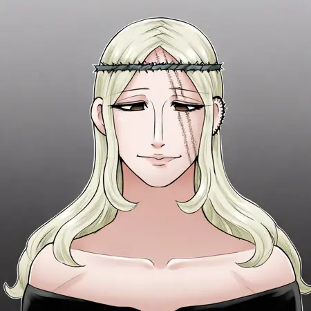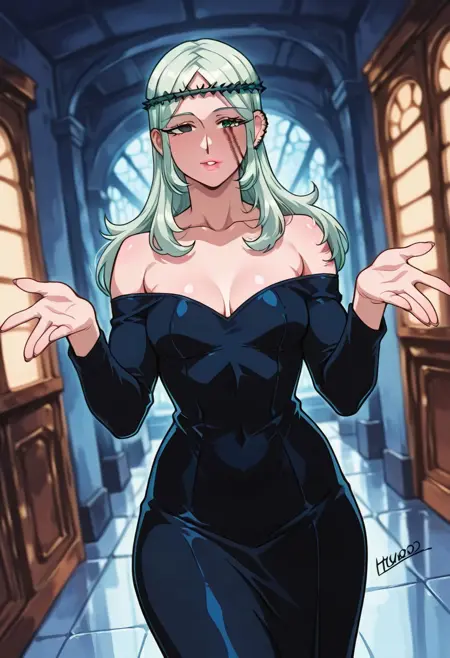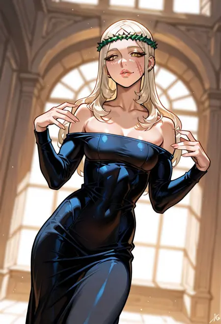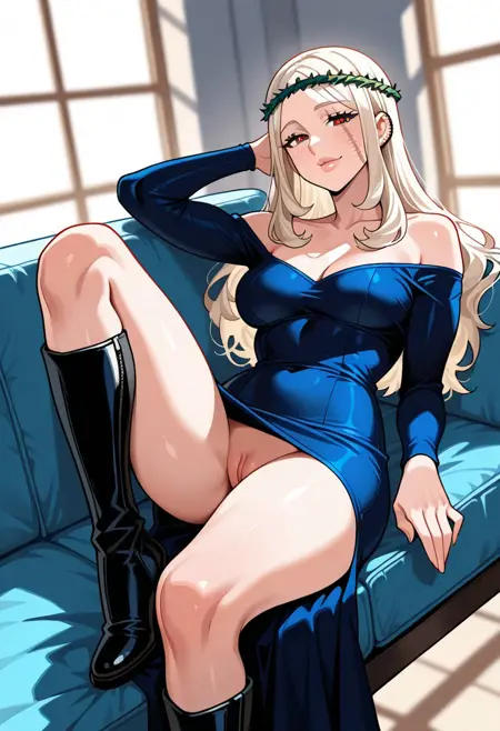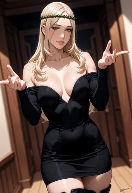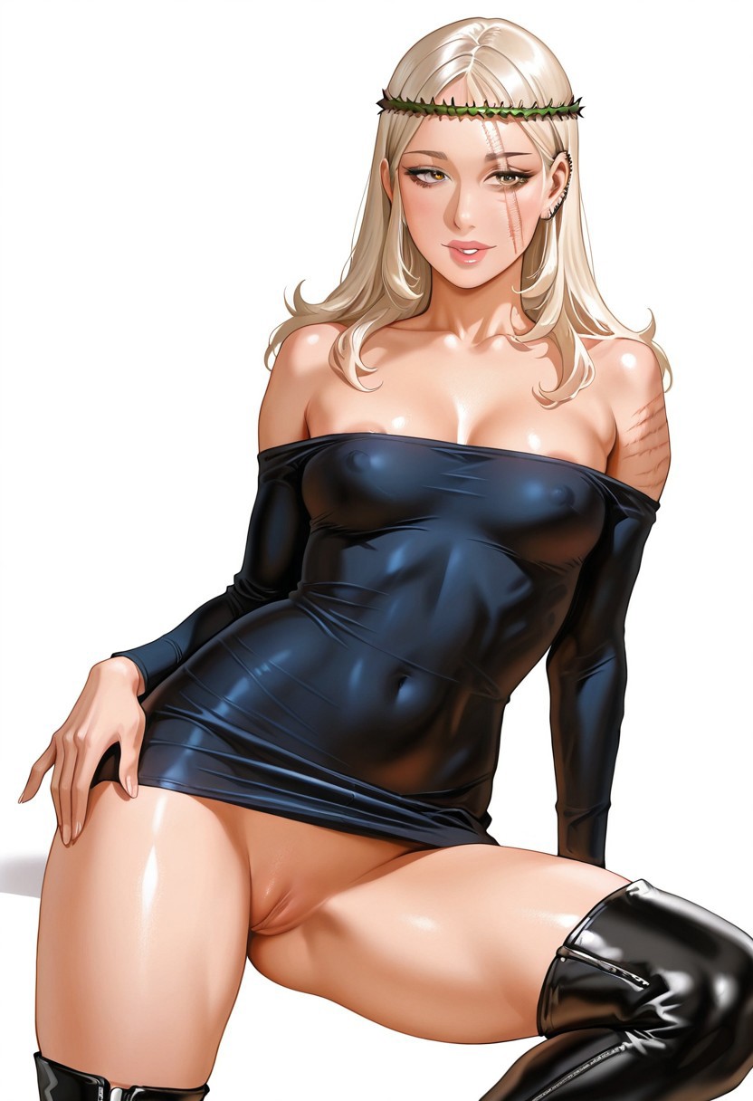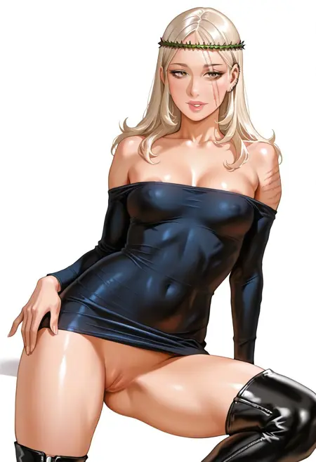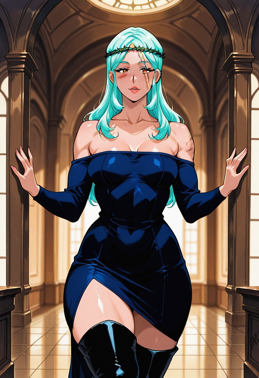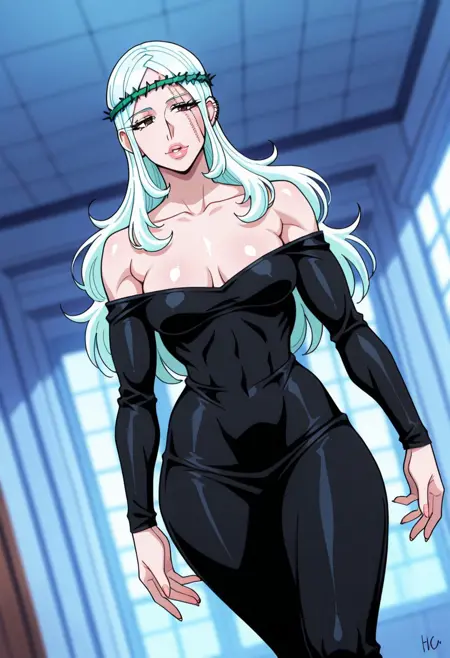 MorenaPrudoHxH、1人女の子、単体、背の高い女性、細身の女性、アーモンド形の茶色い目、長い髪、濃い青の髪、左耳のピアス、顔に並行した2本の傷、ふっくらとした唇、緑の茨の冠、鎖骨、大きな胸、肩出し、肩なしのドレス、黒いドレス、ぴったりしたドレス、長袖、太ももが太い、黒いブーツ、