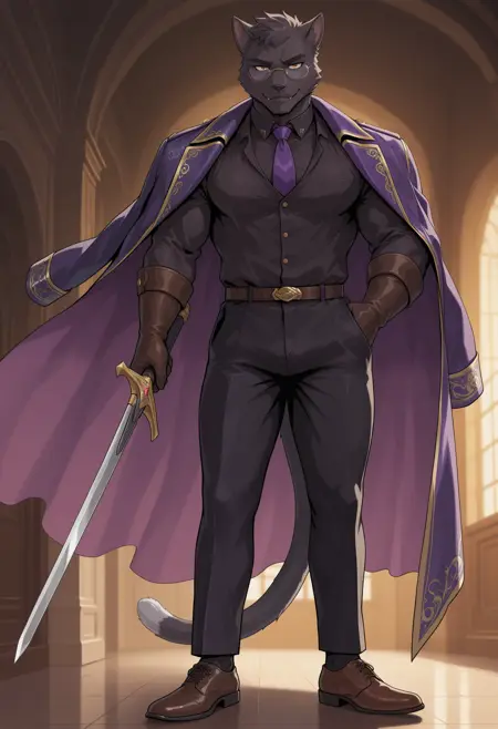 主要服装:紫色眼镜、棕色手套、黑色扣子衬衫、紫色斗篷、黑色裤子、棕色鞋子、武器、紫色领带,
