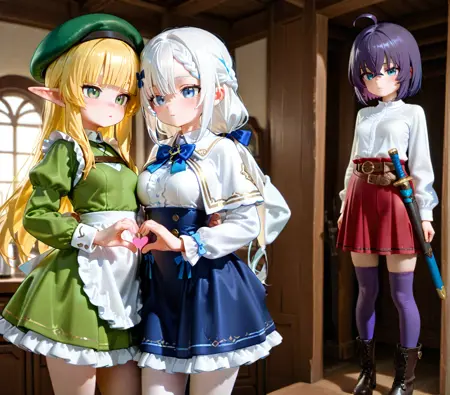 提个醒,不同方式触发的角色权重不一样,lora权重>多个特征tag角色(OC)>单触发词角色(大模型认识的)。如果三个人物是lora、tag、触发词各一个(我主页那个是俩lora+触发词),那需要尽量多给那个触发词角色加点特征描述,因为三人文生图不太稳定,高权重的容易给权重低人物的“吃掉”,所以三人流我一直留有一个图生图的工作区域。