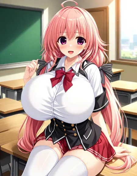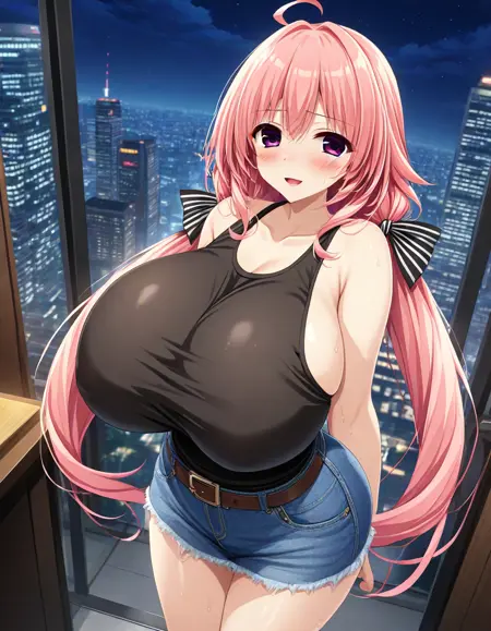 추천 프롬프트: Nazuna Komachiya, 큰 가슴, 보라색 눈, 분홍색 머리, 긴 머리, 아호게, 낮은 트윈테일, 머리 리본,