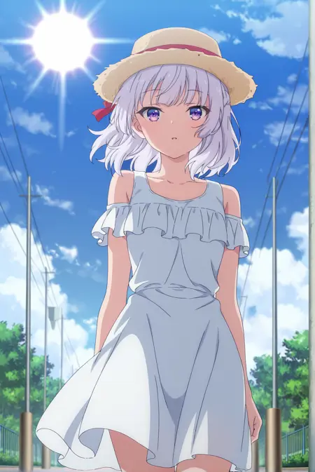 ホワイトドレス:arisu-sa、1girl、シルバー髪、ショートヘア、パープルアイ、麦わら帽子、ドレス、ホワイトドレス、オフショルダー、フリルトリム、ノースリーブ、裸の腕、裸の肩