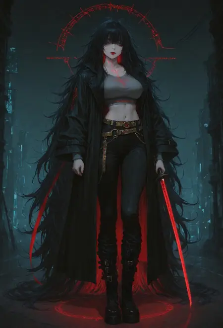 この LoRA は唯一無二のビジョンを喚起する:長く儀式的に縫い合わされたコートに包まれた背の高いシルエット;都市の地獄の風景の奥から炎のように燃える瞳が、揺らめく呪文記号で飾られた街路を捉え、蒸気がjudgmentのような音を立ててプラットフォームブーツの周囲を纏う。