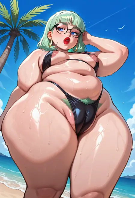 83ryl_8u88le, 1girl, solo, short green hair, blunt bangs, blue eyes, black framed glasses, hoop earrings, red lipstick, fat arms, plump, small perky breasts, puffy areolae, perky nipples, wide hips, thick thighs, huge ass, fat rolls, fat mons, pubic hair, nude, pink high-heels,