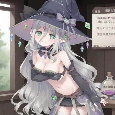 两种替代制服:Laevigata_default,胸部,乳沟,女巫帽,白色过膝袜,绿眼睛,尖耳朵,珠宝,宝石,肚脐,裙子,分离式袖子,露指手套,深色肘部手套,蝴蝶结,黑色颈饰,腰带上挂着药水,