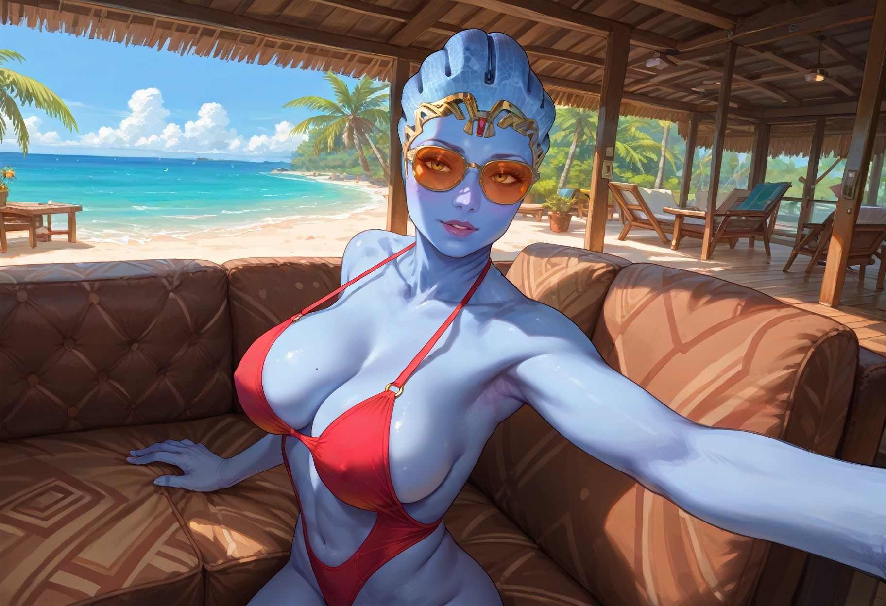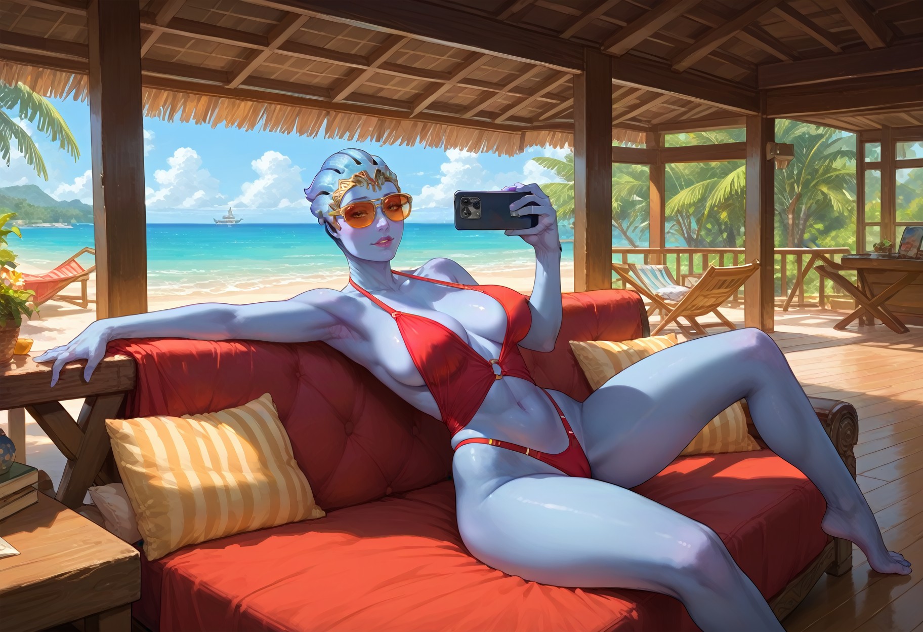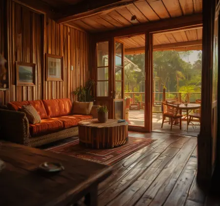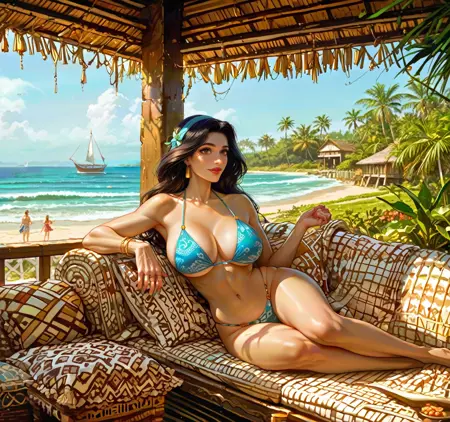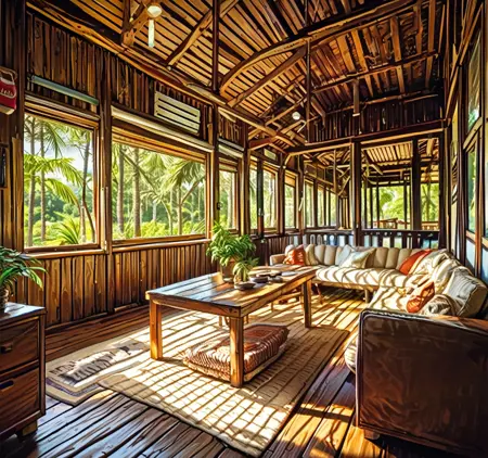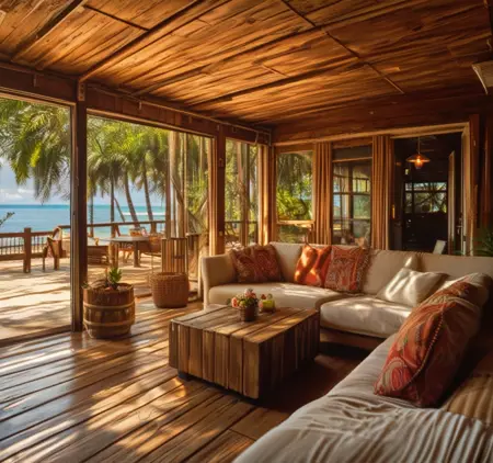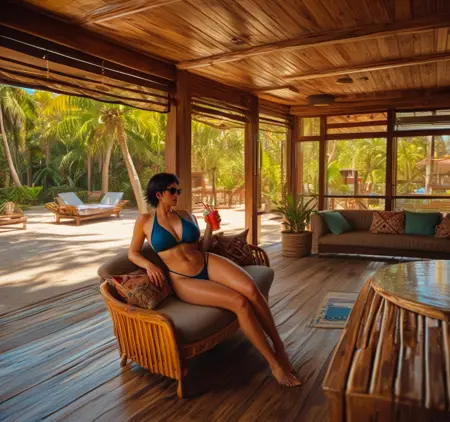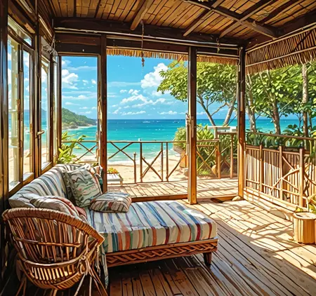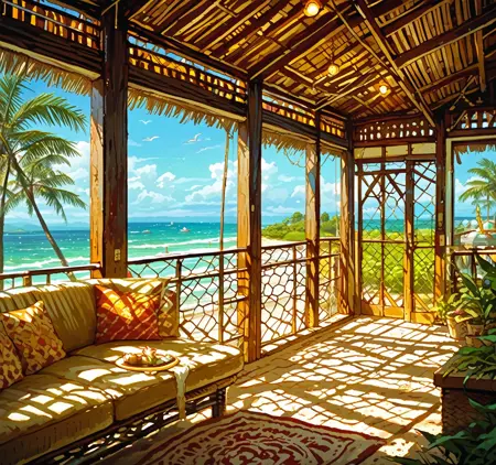 Triggers: Bungalow, resort, plus additives like indoors, outdoors, scenery, table, chair, tree, wooden floor, plant, bed, couch, fence, wall, beach, ocean, wooden floor, swimming pool, porch, pillow, window, cushion, nature, hammock, potted plants etc...